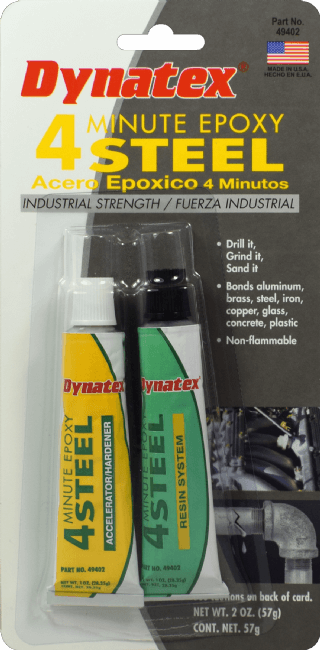 Dynatex® 4 Minute Steel Epoxy is a fast-setting, industrial strength epoxy that is excellent for bonding metal to metal or repairing defects in metal, wood and masonry. Hardens to a steel-like mass that can be drilled, tapped, sanded, filed or painted once fully cured.